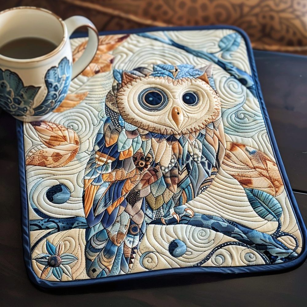 owl placemat, midnight owl mat, quilted placemat, nature table decor, cotton placemat, machine washable, wildlife kitchen accessory, nocturnal design