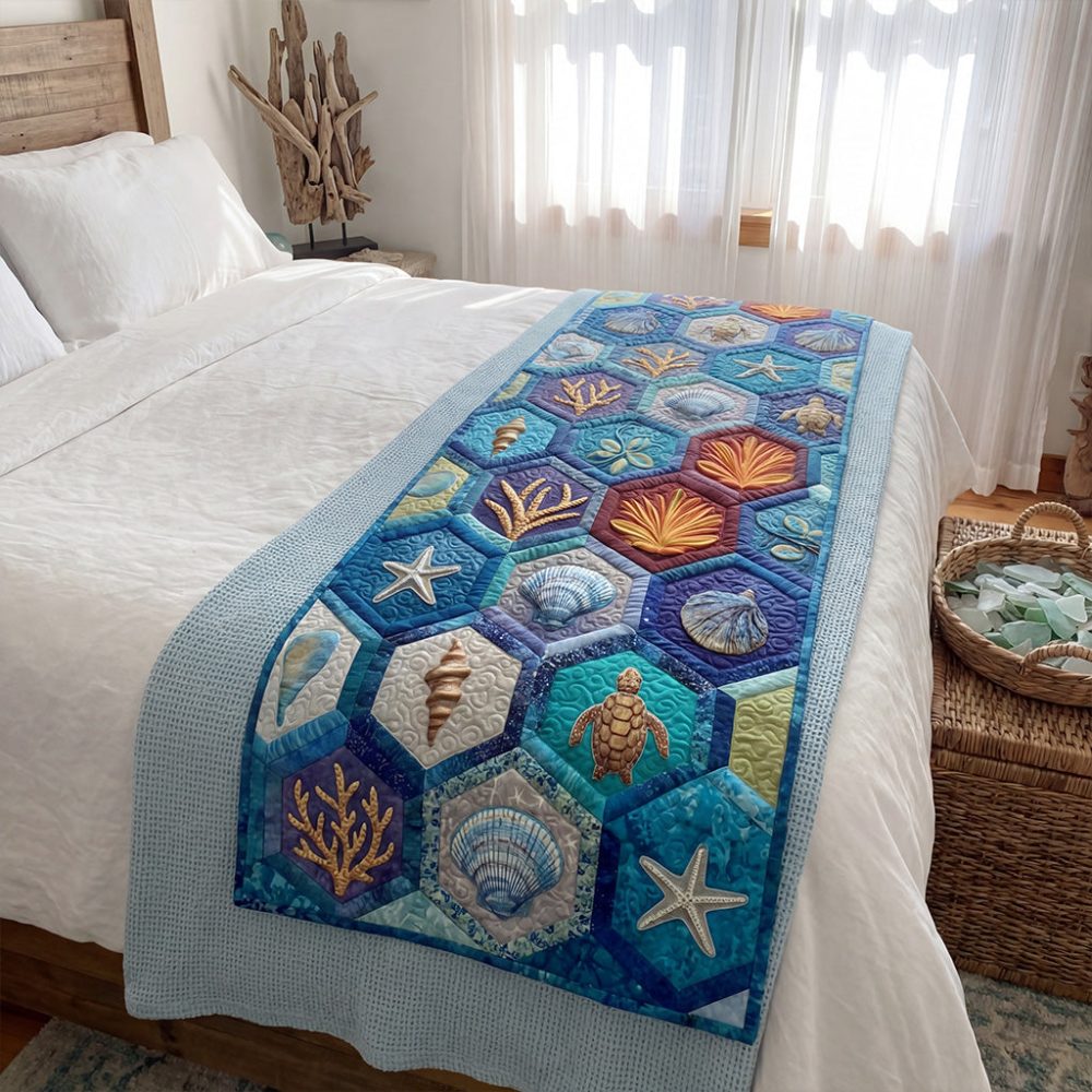 Mystic Shell Circle Quilted Bed Runner — Decorative Nautical Shell Pattern, Quilted Cotton-Blend Throw To Add Coastal Charm & Texture To Any Bed