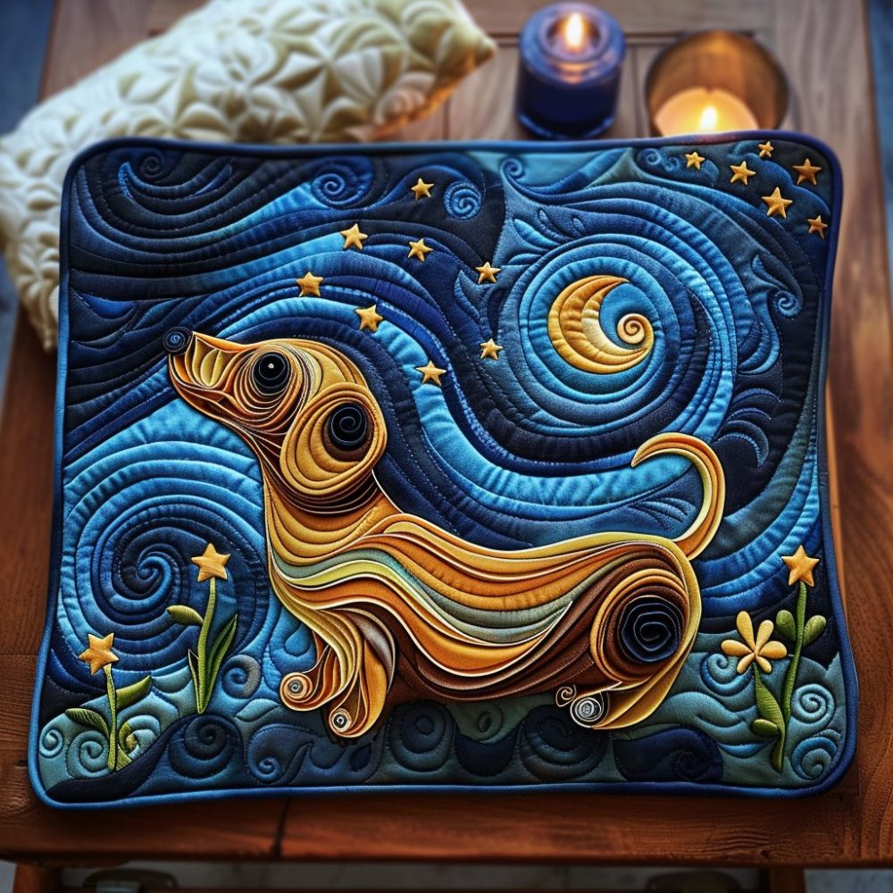 Elegant Nocturne dachshund placemat designed to elevate dinner settings with a sophisticated nighttime motif. Durable quilted cotton and cushioned padding protect tabletops and reduce spills; secure non-slip backing keeps everything in place. Easy to wash and an attractive gift option for dachshund enthusiasts and dog-themed decor fans.