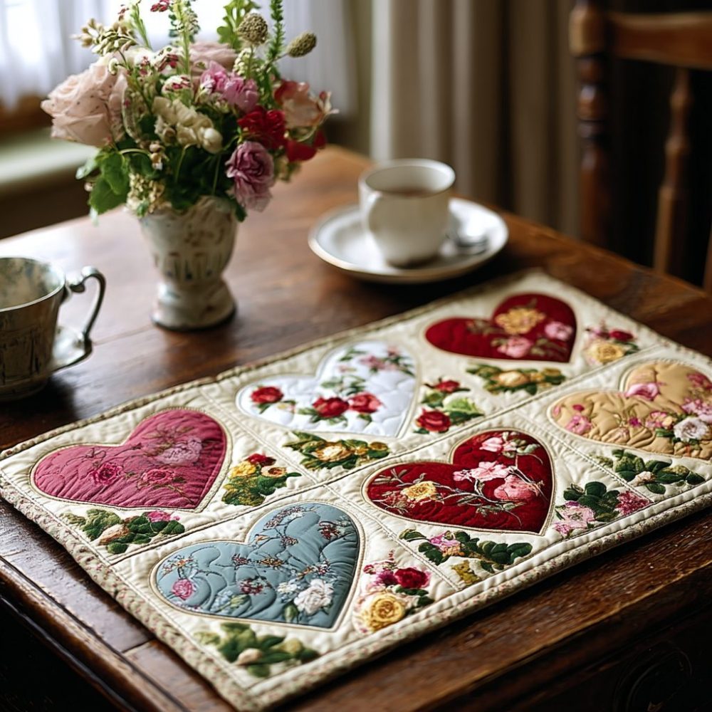 patchwork hearts placemat,quilted heart placemat,colorful table mat,cotton placemat,family dining accessory,machine washable placemat,kids table decor