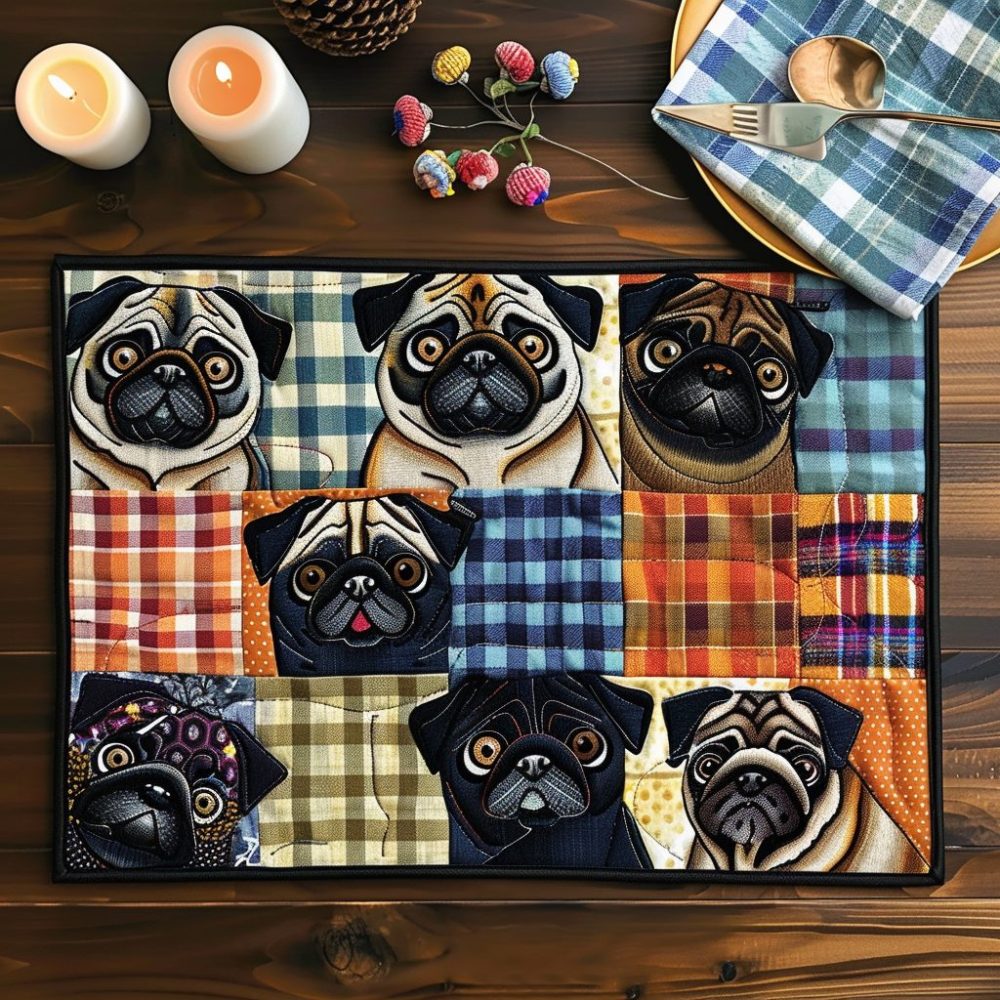 playful pug placemat, pug design placemat, quilted dog placemat, whimsical table mat, machine washable placemat, pet lover gift, bright table decor