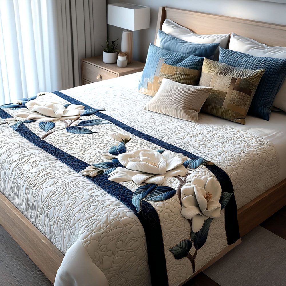 Premium Magnolia Quilted Bed Runner — Floral Decorative Bed Scarf For Bedroom, Reversible Cotton Blend, Machine Washable