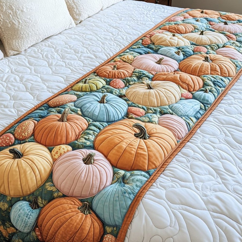 Pumpkin Meadow Quilted Bed Scarf — Soft Fall Accent Runner, Reversible Harvest Bedding Throw For Cozy Rooms