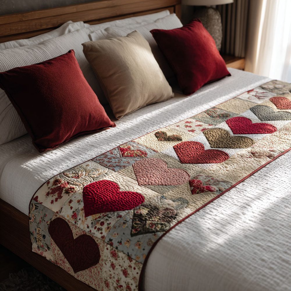 quiet love bed scarf,heart quilted runner,romantic bed runner,decorative bed scarf,soft bed runner,bedroom accent,machine washable
