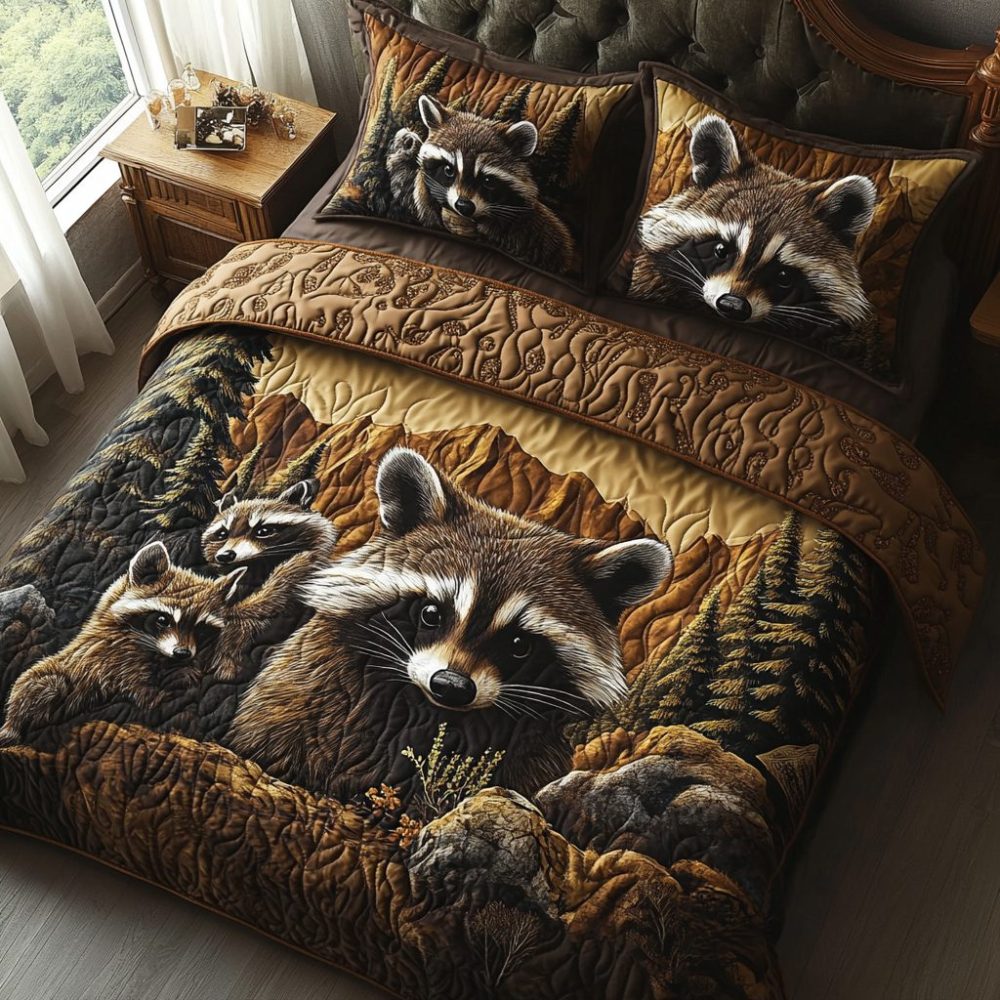 Raccoon Family 3-Piece Quilted Bedding Set