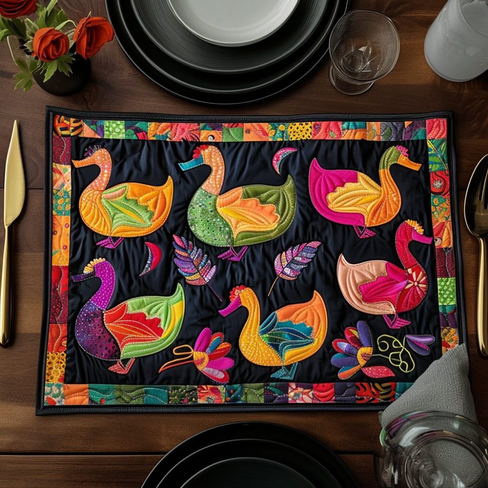 duck swarm placemat,playful duck placemat,quilted dining mat,heat resistant placemat,non-slip placemat,machine washable,kitchen accent