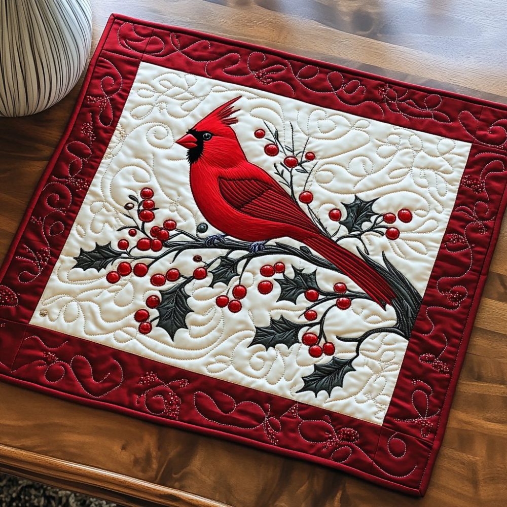 Red Feathered Winter Quilted Placemat — Vibrant Holiday Table Accent With Bold Red Bird Design, Reversible & Easy Care