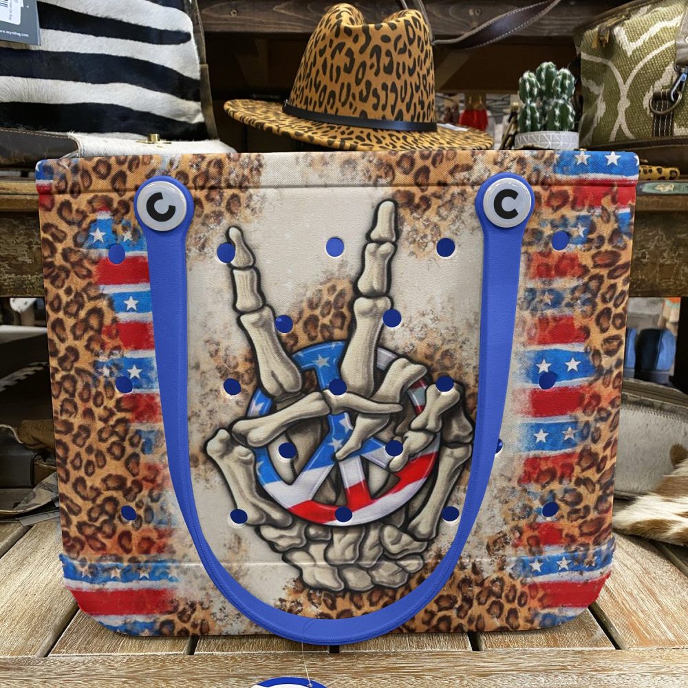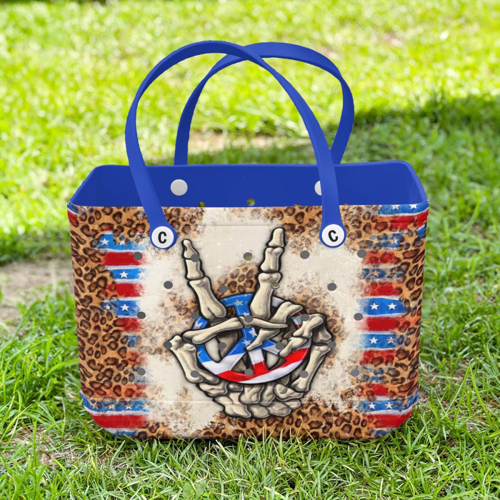 Be the first to review “Rock & Roll Style Tote Bag – Bold Skeleton Hands Design With Stars & Stripes Accent”