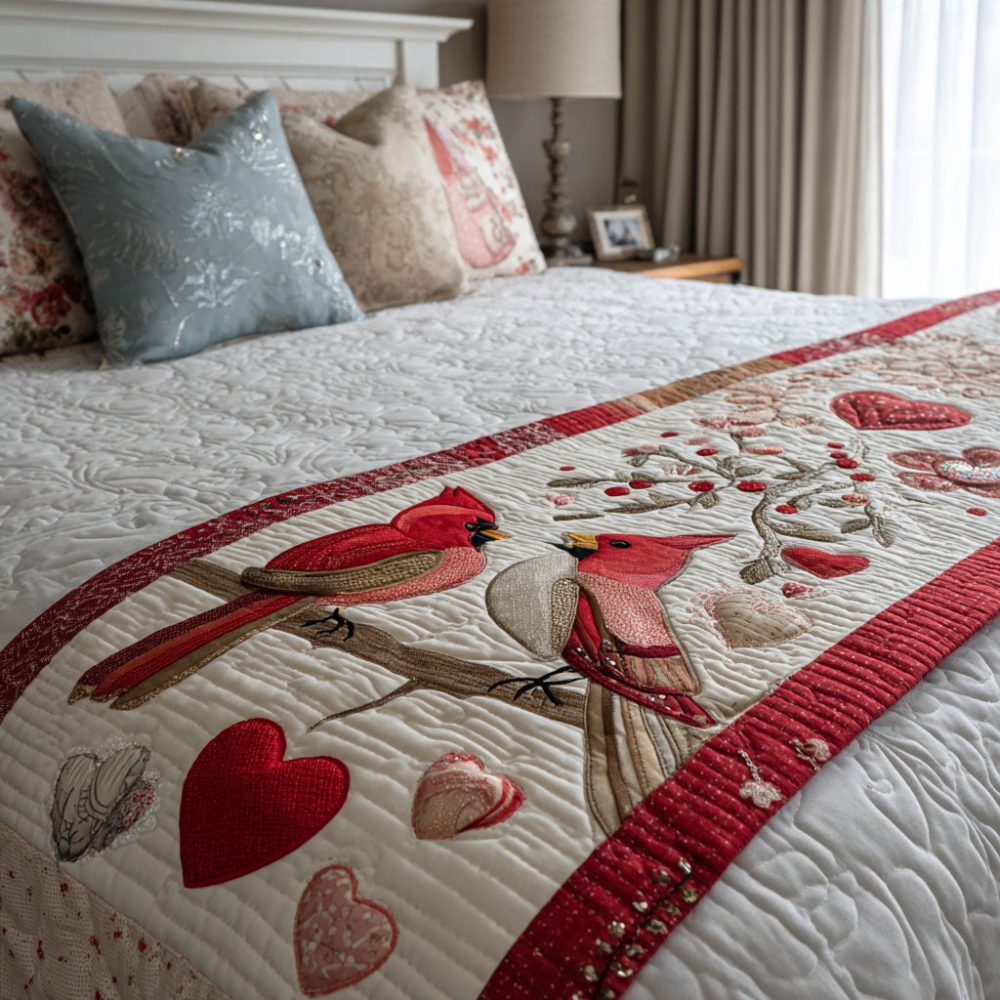 Romantic Birdsong Quilted Bed Runner — Floral Bird Motif Bed Scarf For Cozy Bedroom Decor & Layered Quilt Accent, Soft Durable Finish
