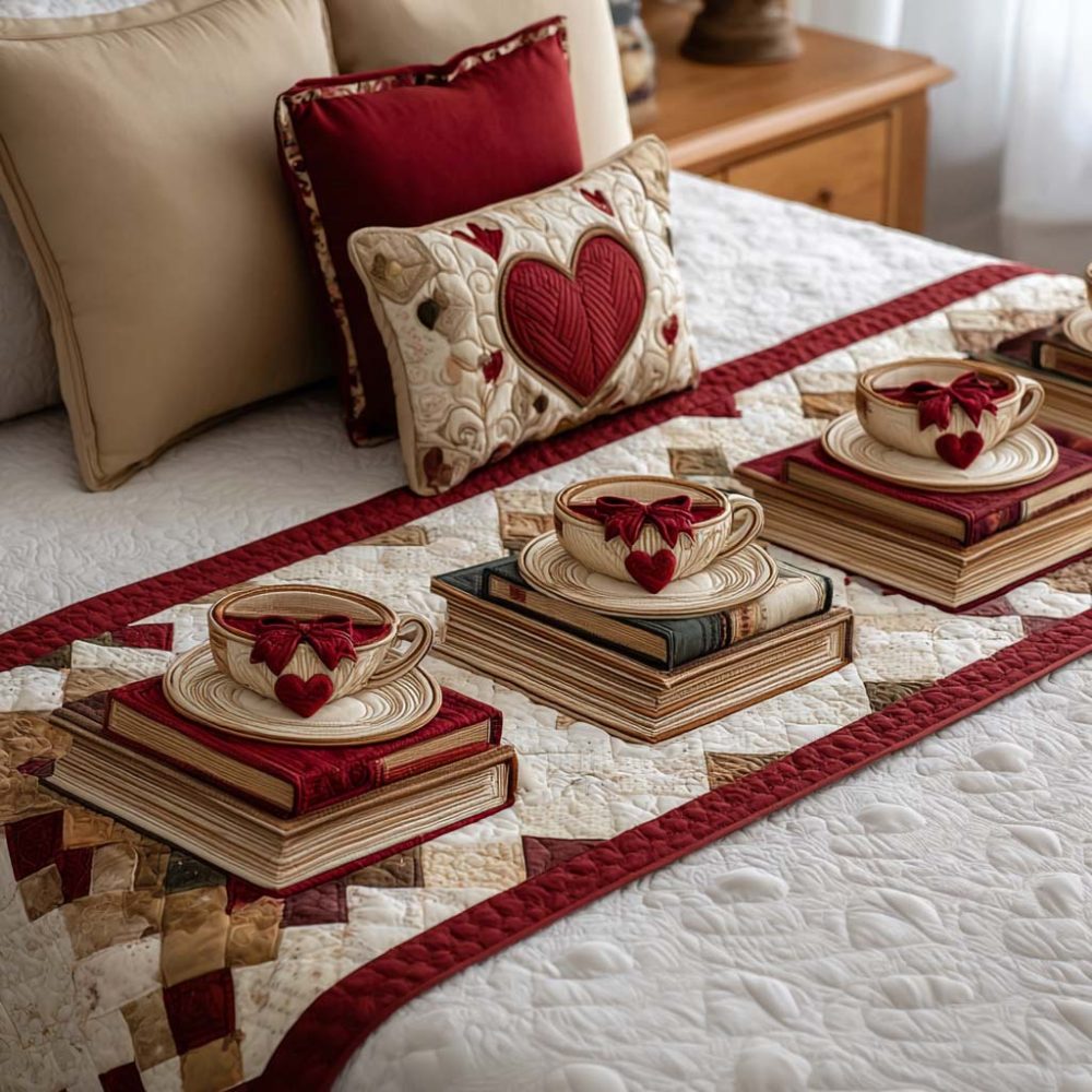 Romantic Pages Quilted Bed Runner — Book-Themed Heart Accent Bedding, Soft Quilting, Stylish Bedroom Layering Piece