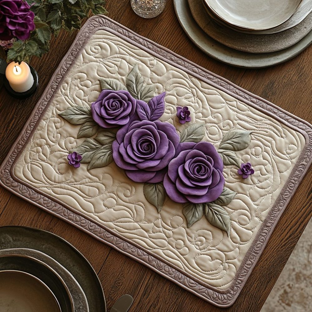 royal petals placemat, luxury floral placemat, quilted table mat, elegant table decor, machine washable placemat, floral dining accessory, protective placemat