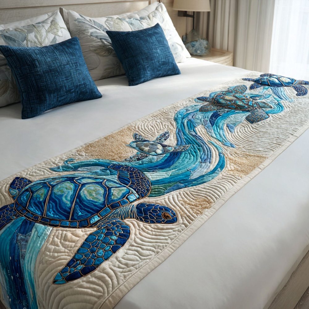 sea turtle bed runner,coastal bed scarf,nautical bedding accent,quilted bed runner,beach house decor,turtle motif runner,soft machine washable runner,queen king bed accessory