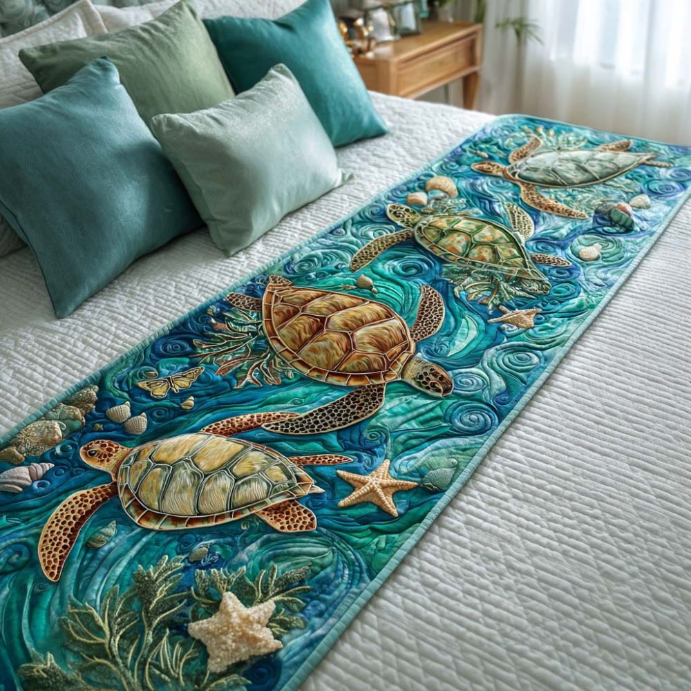 shell turtle bed runner,quilted botanical runner,coastal bedroom accent,reversible bed scarf,cotton blend bed runner,stylish bed runner,decorative runner