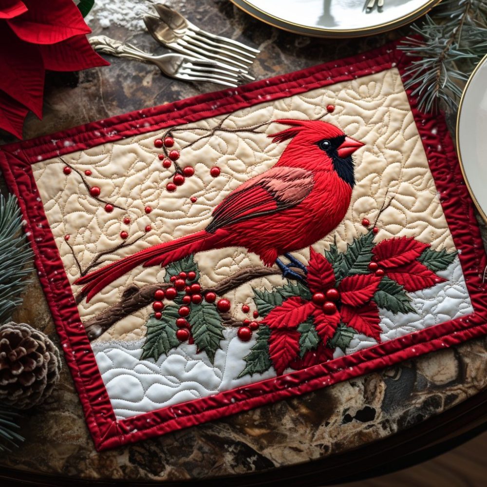 snow cardinal placemat, winter placemat, bird table decor, quilted placemat, holiday dining mat, seasonal coffee table mat, winter decor