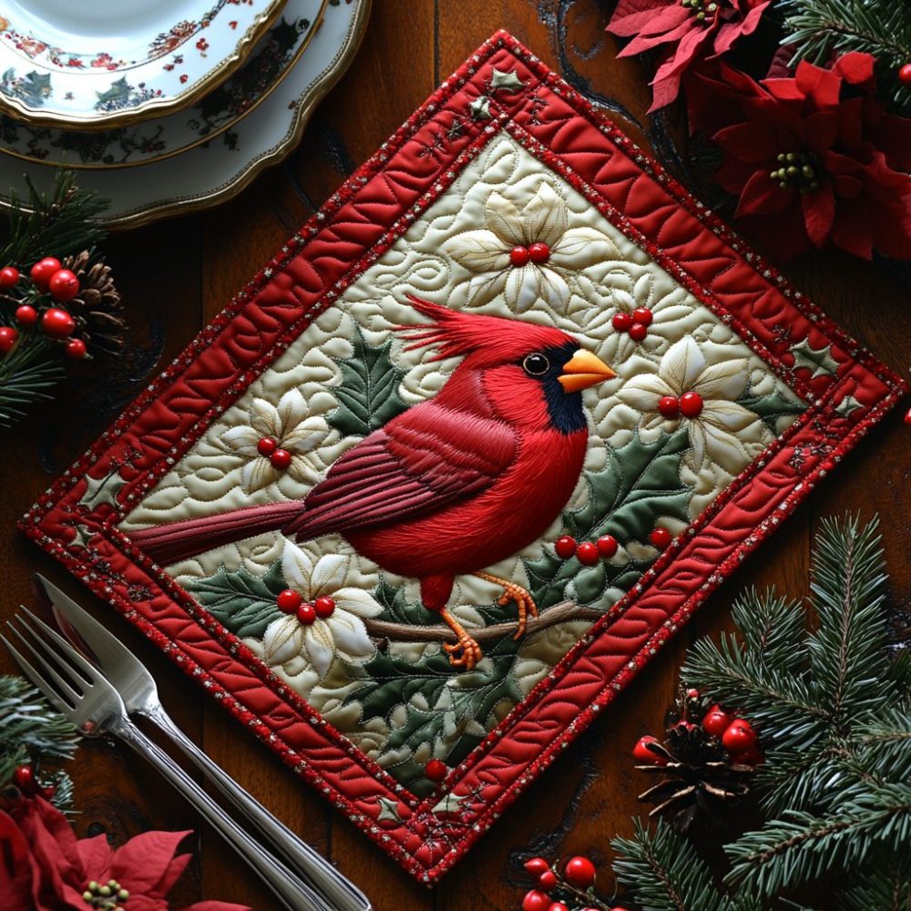 Celebrate winter with the Snow Cardinal quilted placemat featuring a striking cardinal motif. Crafted from a premium cotton-blend with quilted padding to protect against heat and stains, it brings classic seasonal charm to your table. Machine washable for convenient care — perfect for holiday dinners, winter porches, or bird-lover gifts.