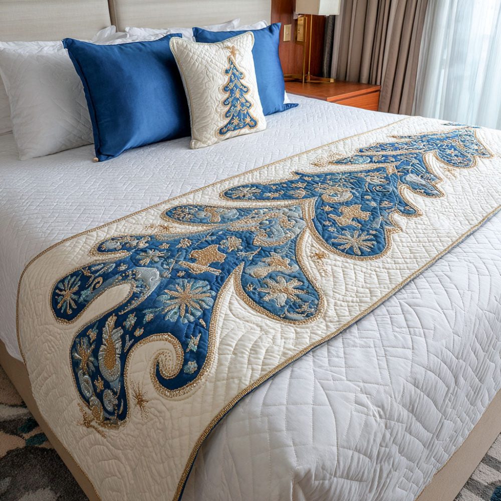 Snowflake Glow Quilted Bed Runner — Elegant Winter Bedding Accent With Delicate Snowflake Embroidery, Soft Quilting, Reversible & Easy Care