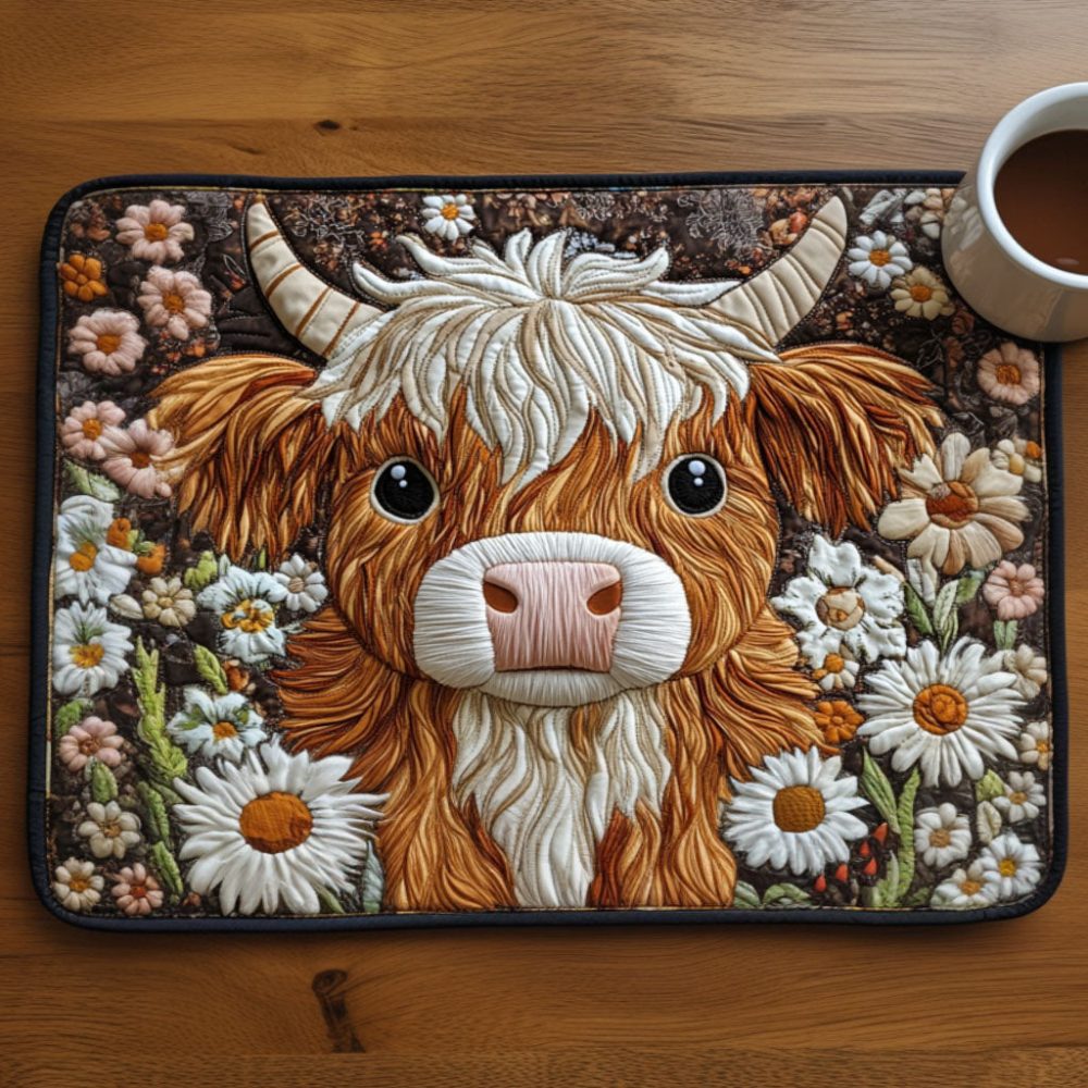 meadow calves placemat, quilted placemat, cotton table mat, farmhouse dining decor, insulated placemat, machine washable table linens, pastoral tableware