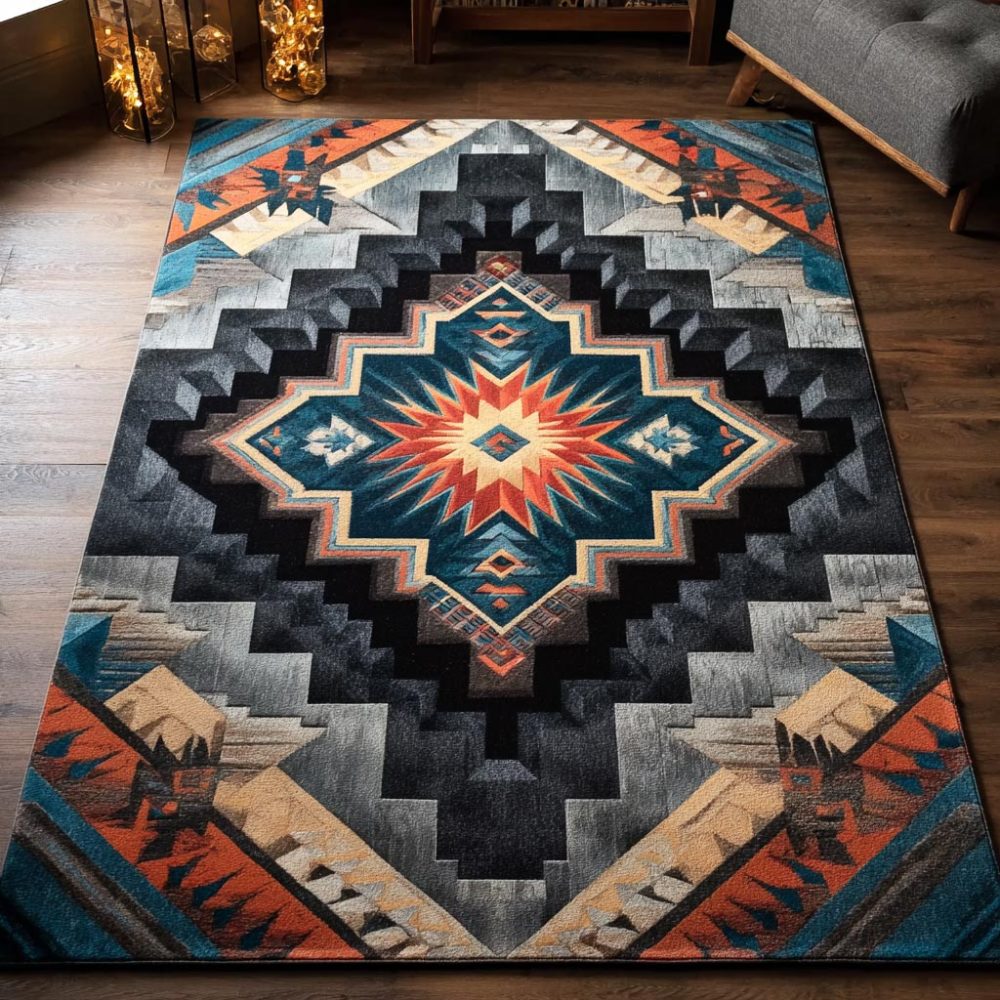 Southwestern Desert Symbols Area Rug — Handcrafted Accent Rug For Living Room, Durable Low-Pile Desert Motif Floor Decor