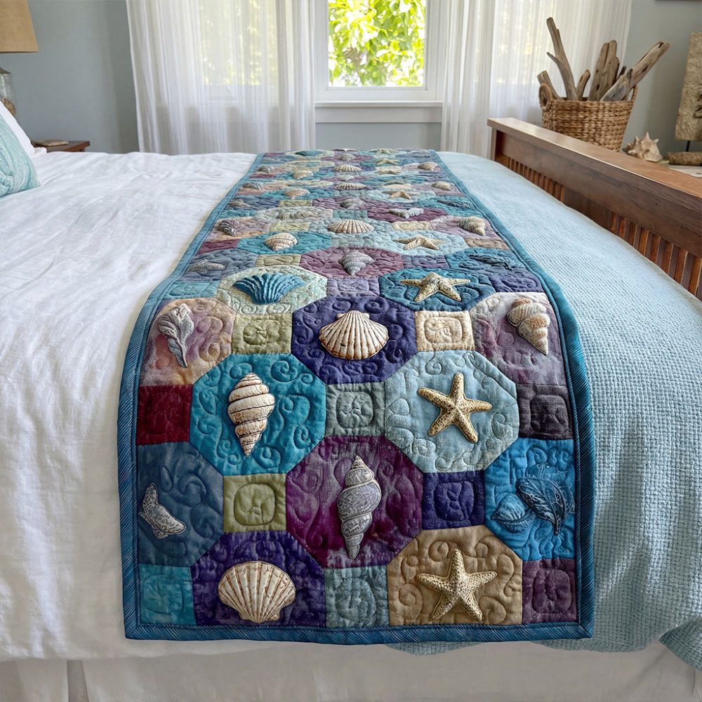 nautilus bed runner, nautical bedding accent, luxury coastal runner, quilted shell throw, cotton blend bedding, beach house decor, machine washable, decorative bed scarf