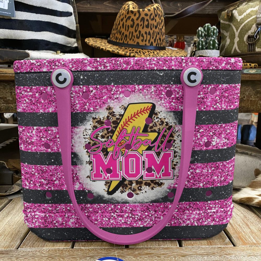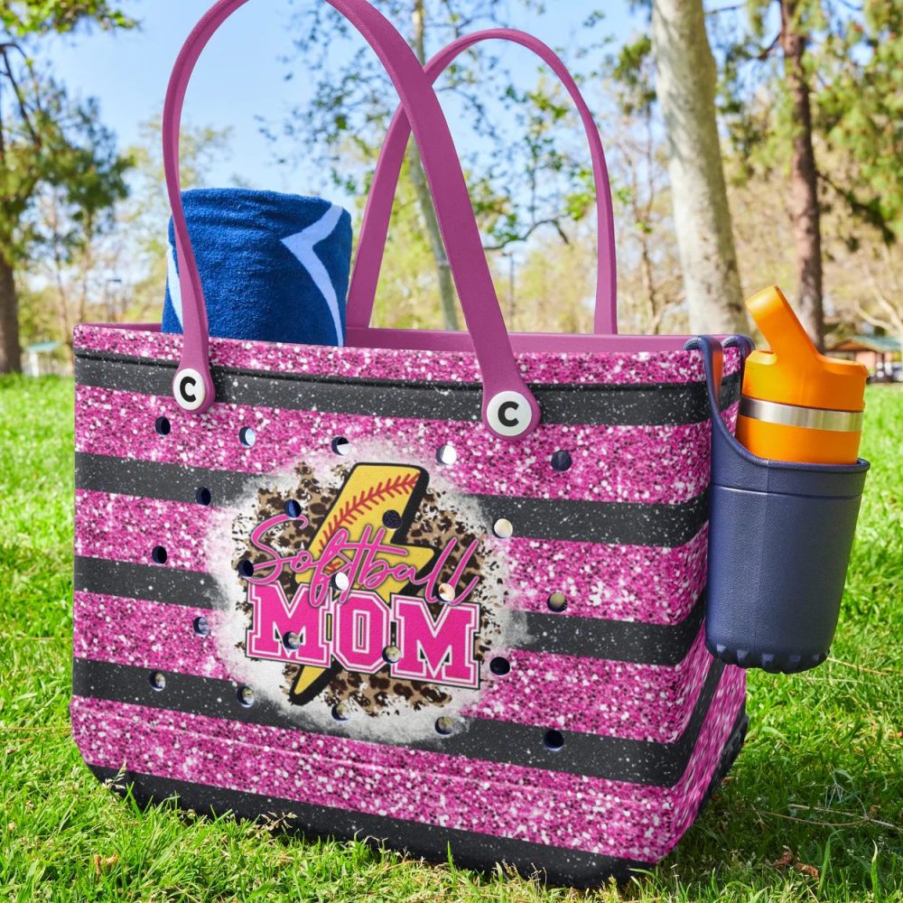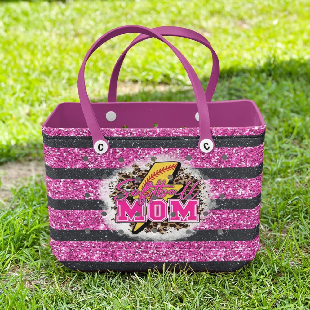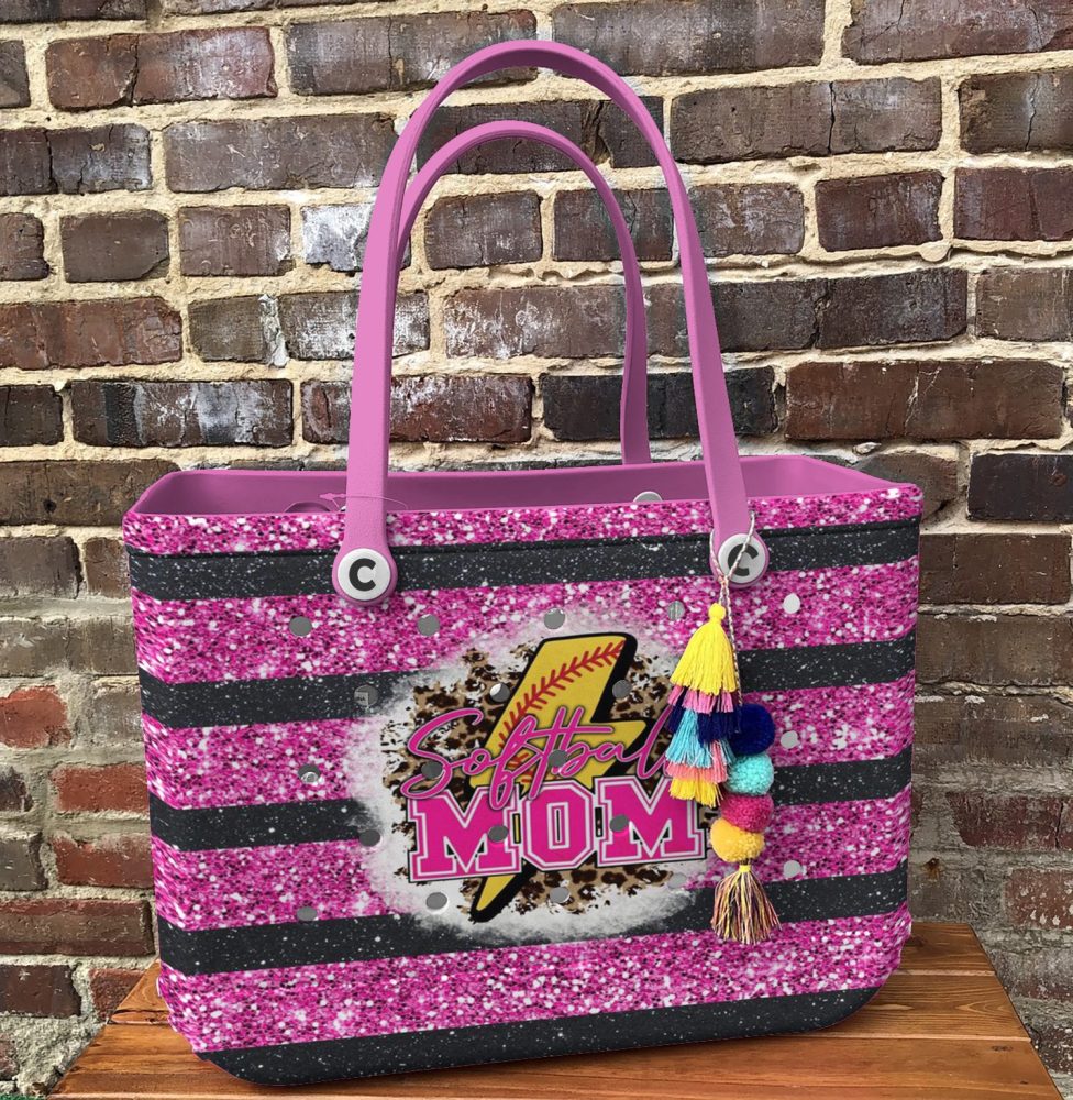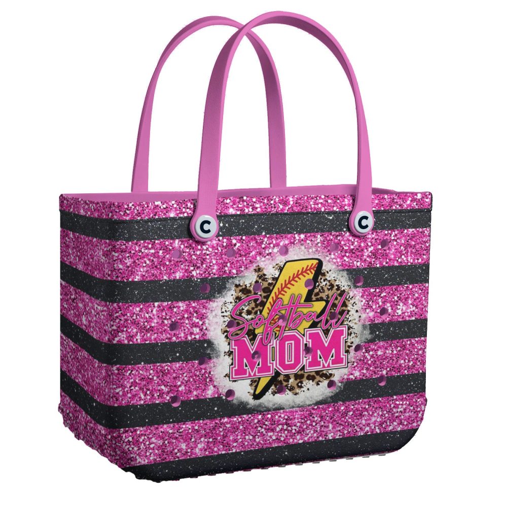 Be the first to review “Sparkling Softball Mom Tote Bag – Stylish Pink Glitter Stripes For Proud Moms”