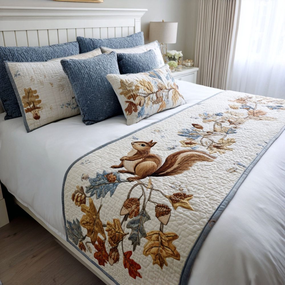 Squirrel Autumn Treasures Quilted Bed Scarf For Queen & King — Cozy Fall Bedroom Accent, Rustic Woodland Quilt Throw