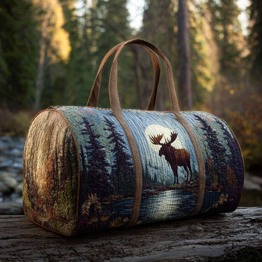 A cozy, cabin-inspired quilted duffle featuring a starlit moose motif—perfect for weekend getaways, gym sessions, or cabin trips. The whimsical woodland design blends rustic charm with a stitched textile look, making this bag a standout carry-on or overnight bag. Roomy interior and durable construction keep essentials organized while the unique printed pattern makes it an ideal gift for nature lovers and anyone who wants outdoorsy style with a comfy, handcrafted feel.