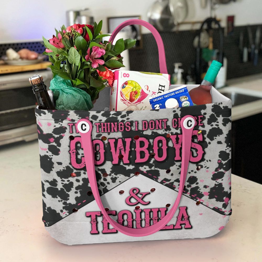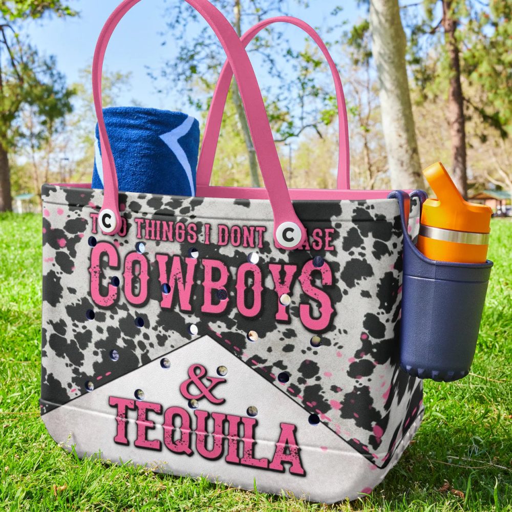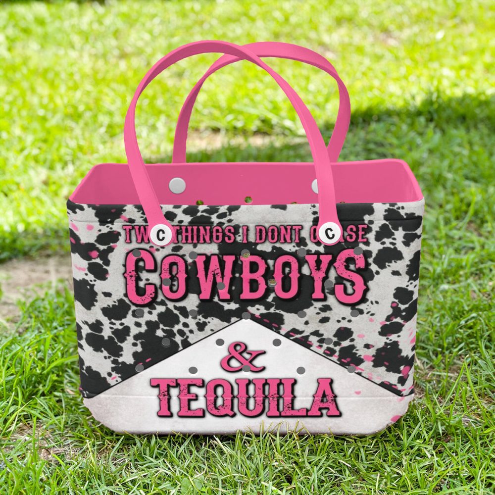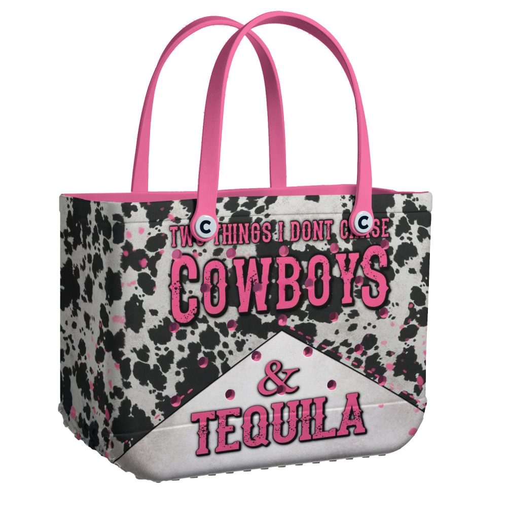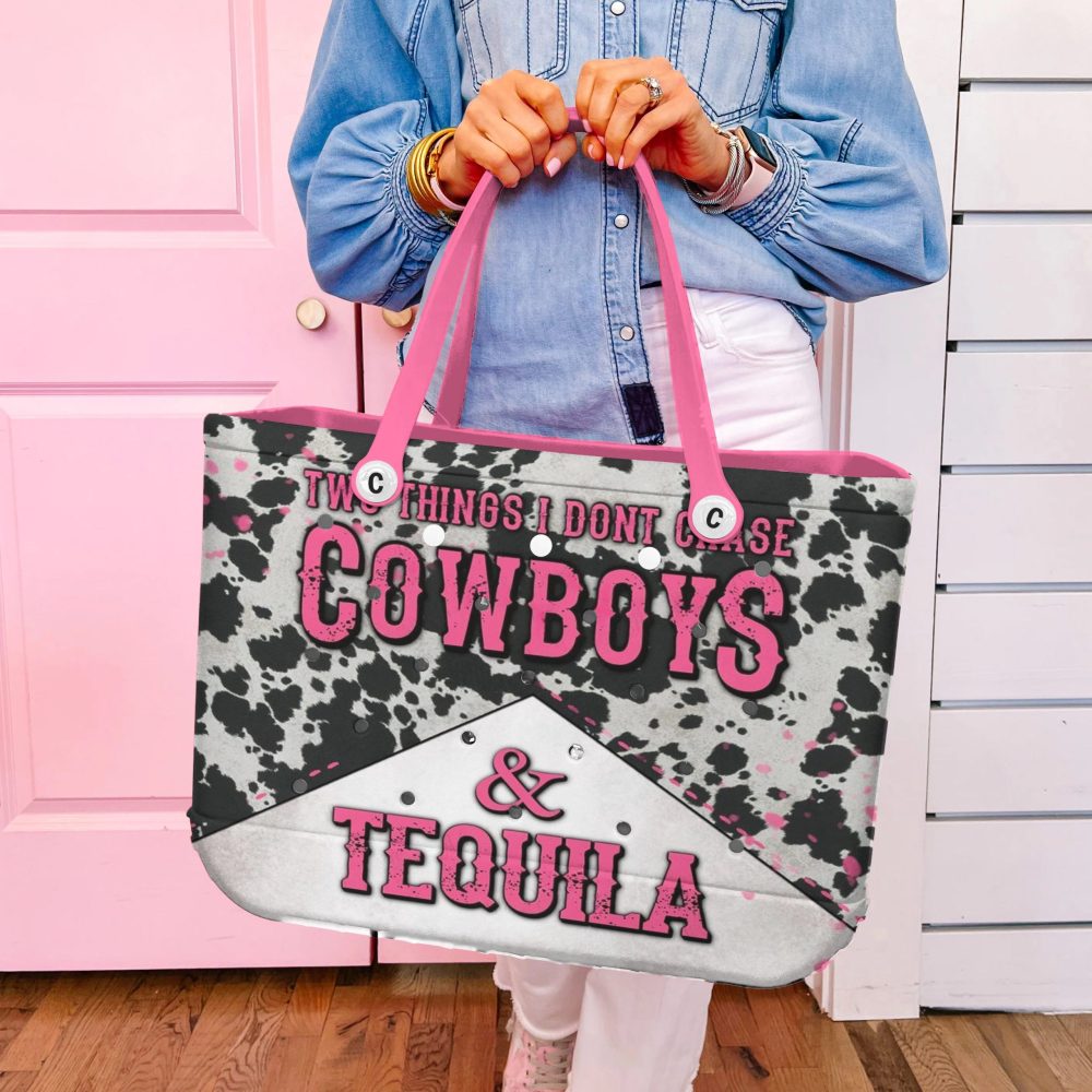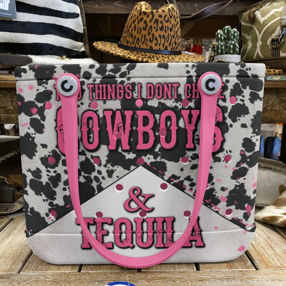 Be the first to review “Stylish Cow Print Tote Bag – Cowboys & Tequila Design With Pink Handles – Perfect For Western Lovers”