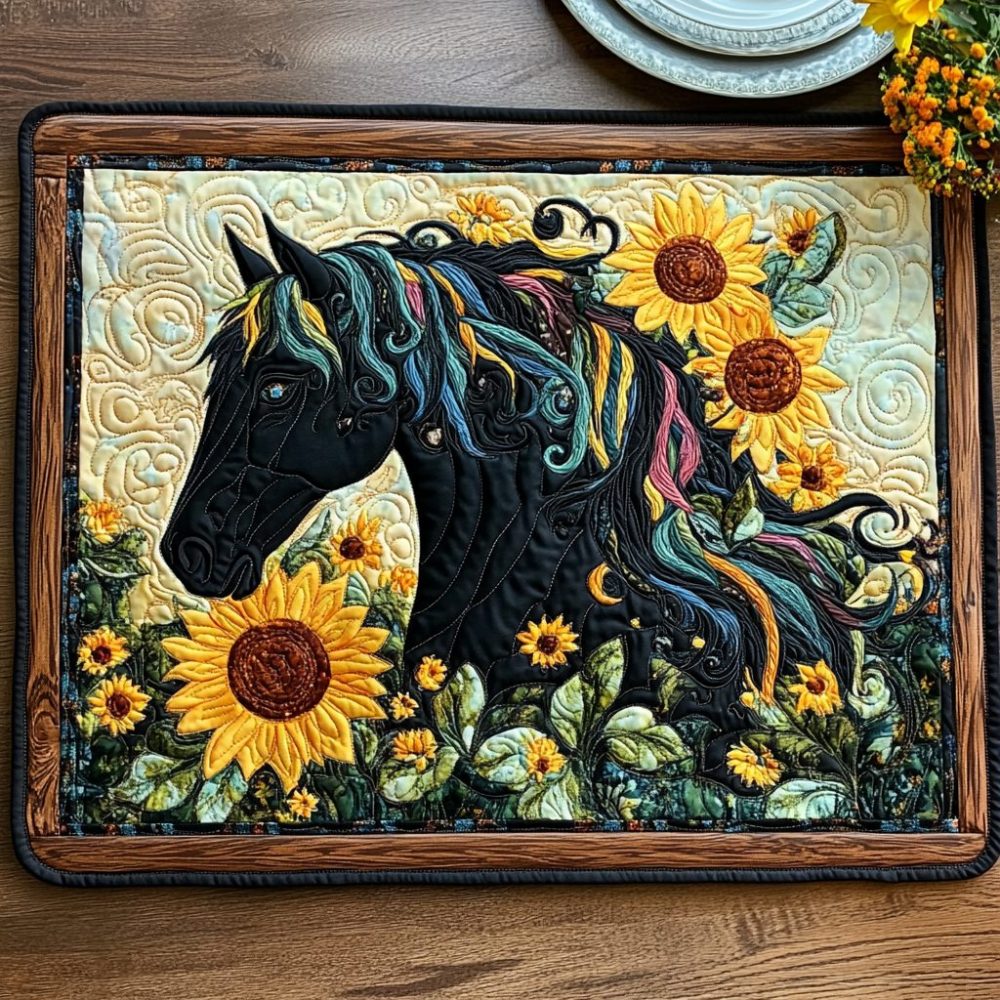 black horse placemat,sunflower horse placemat,farmhouse placemat,bold quilted placemat,durable cotton placemat,heat friendly placemat,machine washable gift