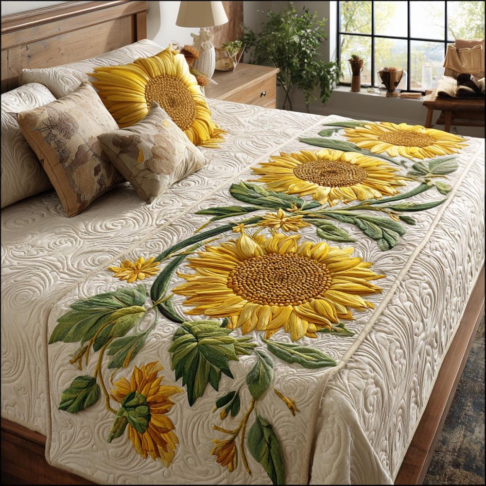 Sunflower Bloom Quilted Bed Runner — Vibrant Floral Bed Scarf, Cotton-Blend Quilting, Reversible, Perfect For Farmhouse Bedrooms