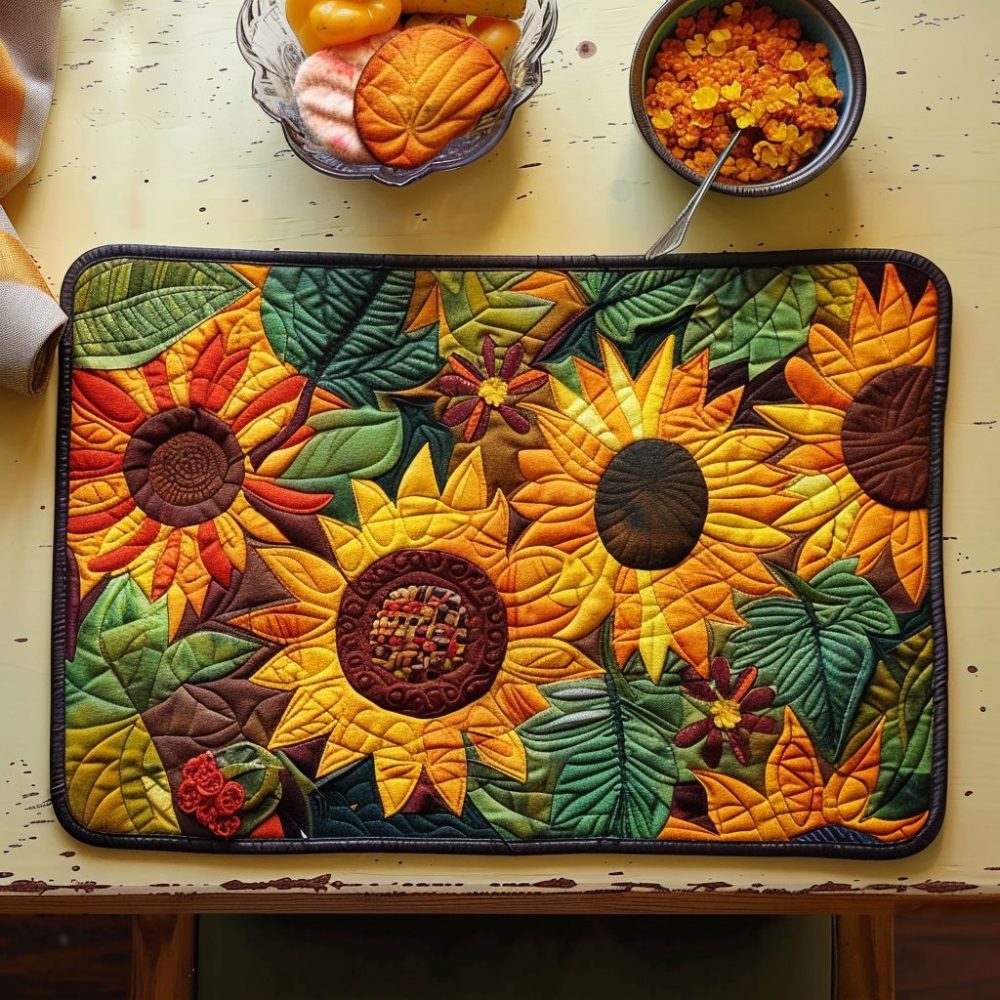 sunflower placemat,garden placemat,quilted placemat,floral table mat,dining room decor,kitchen placemat,machine washable,bright table decor