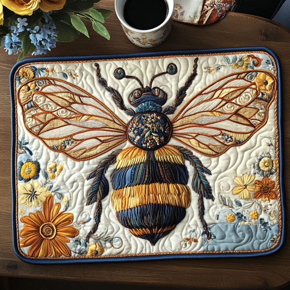 sunlit honeybee placemat, honeybee table mat, floral placemat, yellow quilted placemat, summer table decor, washable placemat, picnic mat