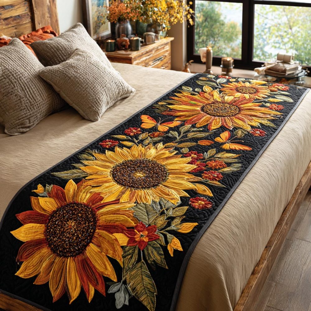 sunny fields bed runner,quilted floral bed scarf,bright bedroom decor,cotton-blend runner,reversible bed scarf,queen king bed runner