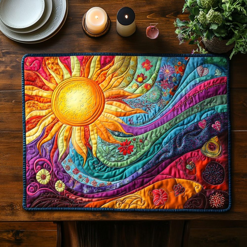 Bring sunny warmth to the table with the Sunny Glow quilted dining placemat. Cheerful hues and soft quilting create an uplifting setting while the padded construction protects surfaces from heat and spills. Easy-care materials make it a low-maintenance favorite for breakfast, brunch, and family dinners. Ideal for layering with coordinating runners and napkins for a cohesive sunny table look.