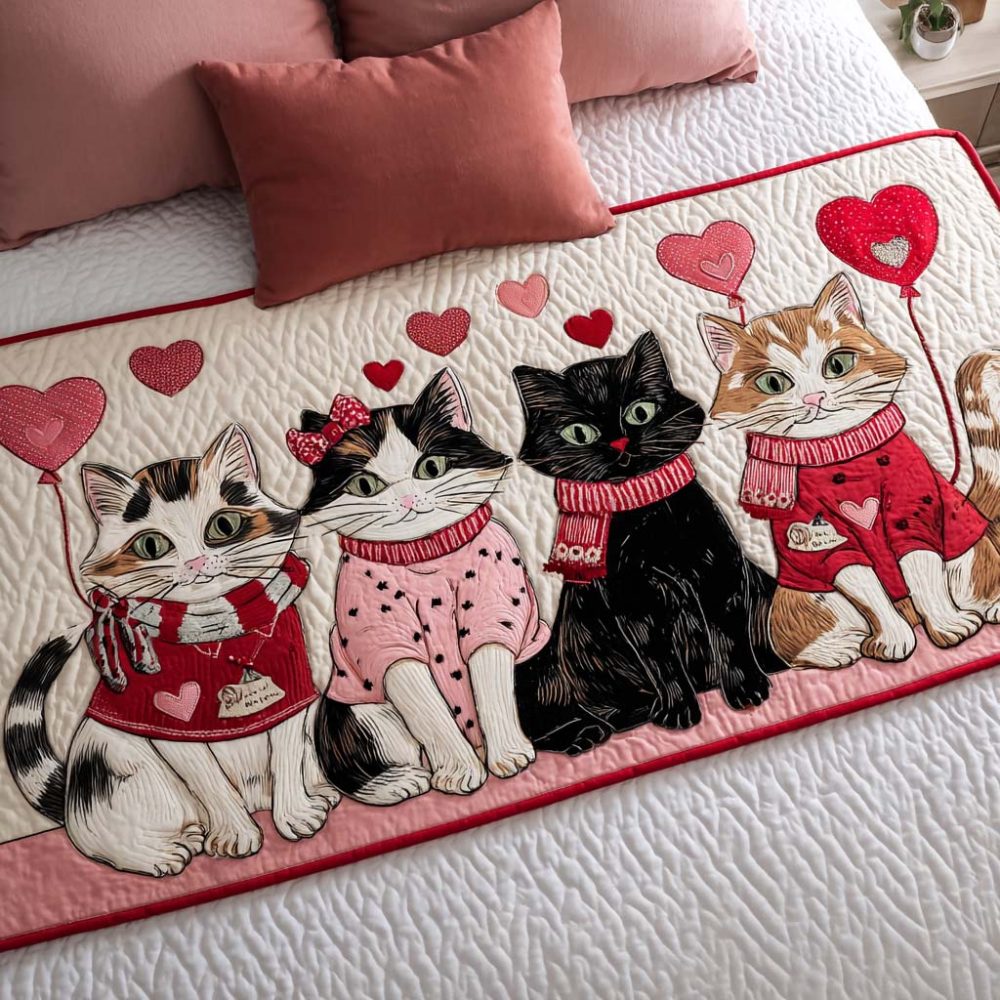 sweet purr bed runner,cat motif bed scarf,heart cat bedding,quilted bedroom accent,cozy cat decor,soft quilted runner,machine washable