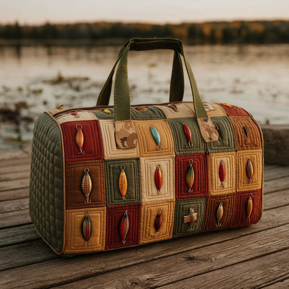 tackle box duffle bag, quilted travel bag, fishing accessories, outdoor adventure gear, stylish gym bag, carry-on luggage, fishing lifestyle, unique travel accessories, weekend getaway bag, fishing enthusiast gift, durable duffle, trendy overnight bag