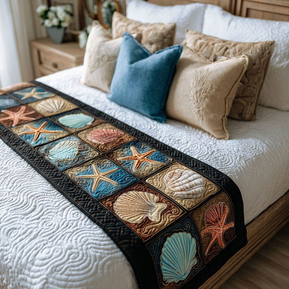 tidal harmony bed runner,coastal quilted runner,nautical bedroom decor,ocean blue bed scarf,cotton-blend runner,reversible queen king