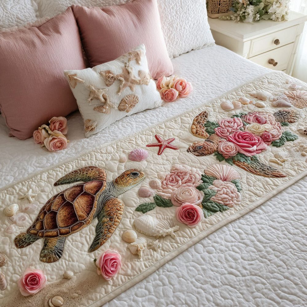 Tidal Roses Quilted Bed Runner — Coastal Rose Design Bed Scarf, Nautical Floral Quilted Accent For Beachy & Cottage Bedrooms