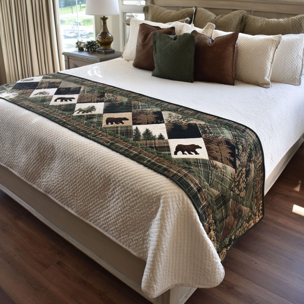 bear bed runner,cabin bed runner,quilted lodge runner,rustic bedding,timber bear decor,cozy bed throw,durable quilted runner,cabin bedroom