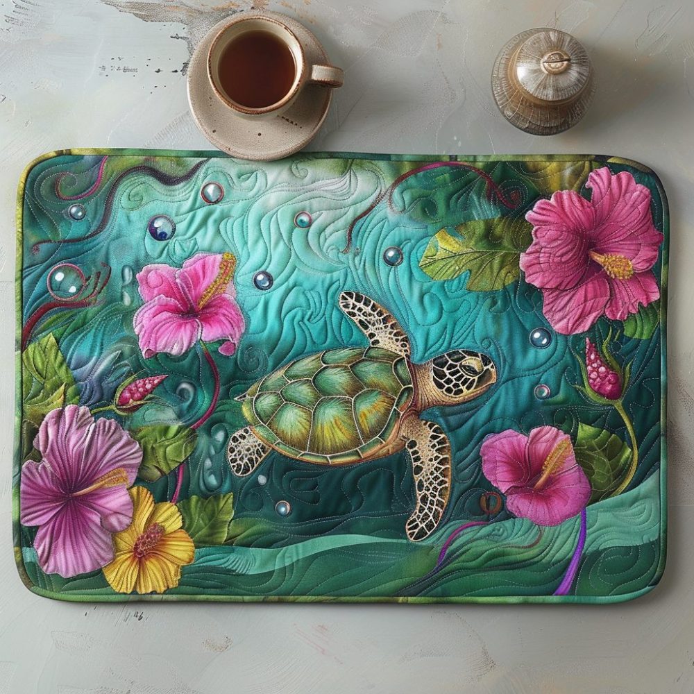 Bring coastal serenity to your table with this sea turtle and hibiscus quilted placemat. Made from soft, quilted cotton with heat-resistant padding, it shields surfaces and resists spills while staying machine washable for effortless care. Perfect for beach houses, summer gatherings, and tropical-themed tablescapes.