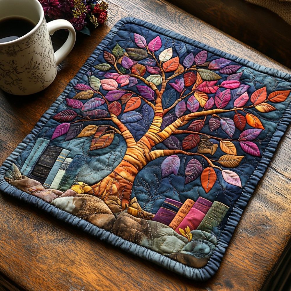 tree of knowledge placemat,quilted dining mat,teacher gift placemat,book inspired table decor,cotton blend placemat,heat resistant,machine washable