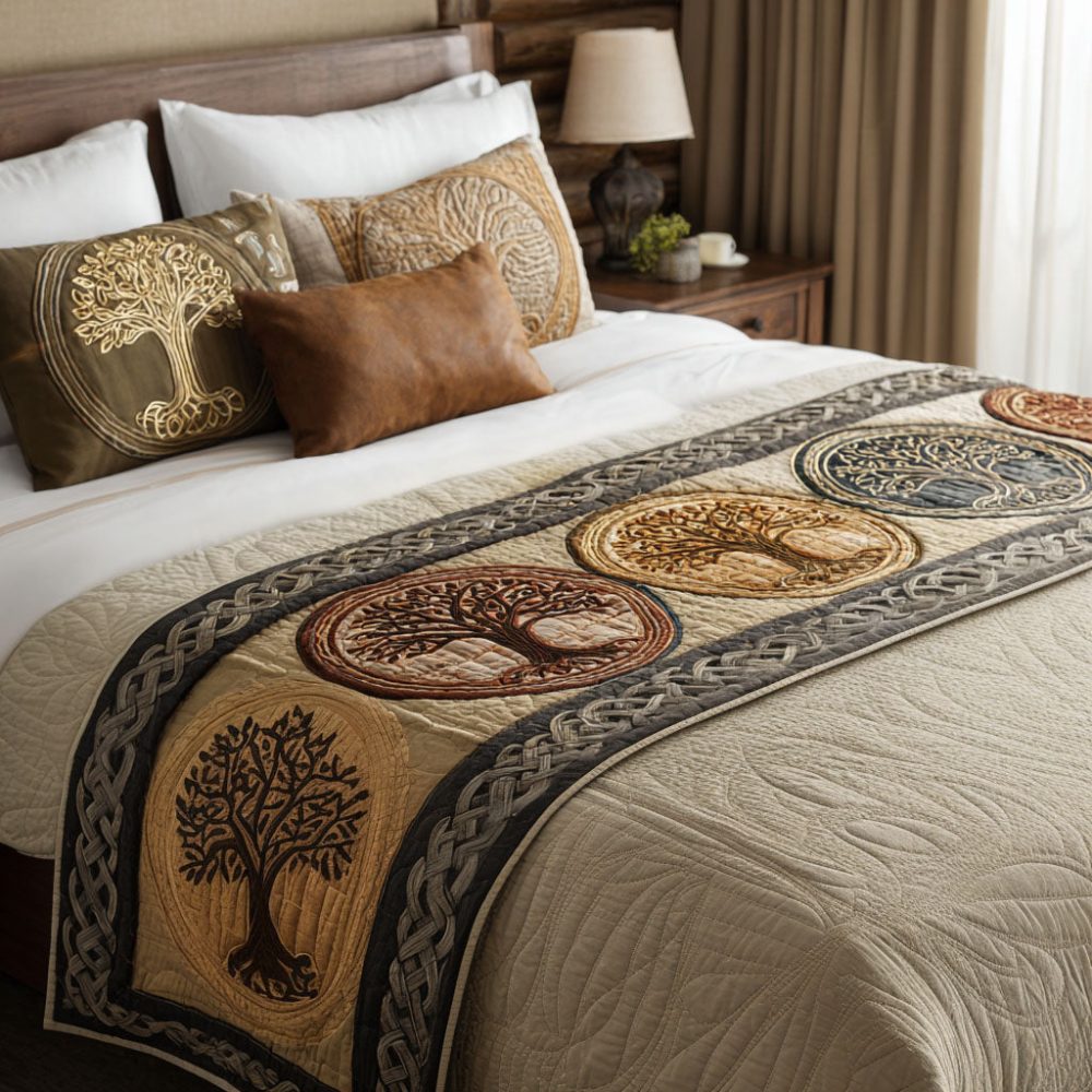 Tree Of Life Comfort Quilted Bed Scarf — Boho Botanical Bed Runner, Inspirational Tree Motif For Tranquil Bedroom Vibes, Reversible & Cozy Accent