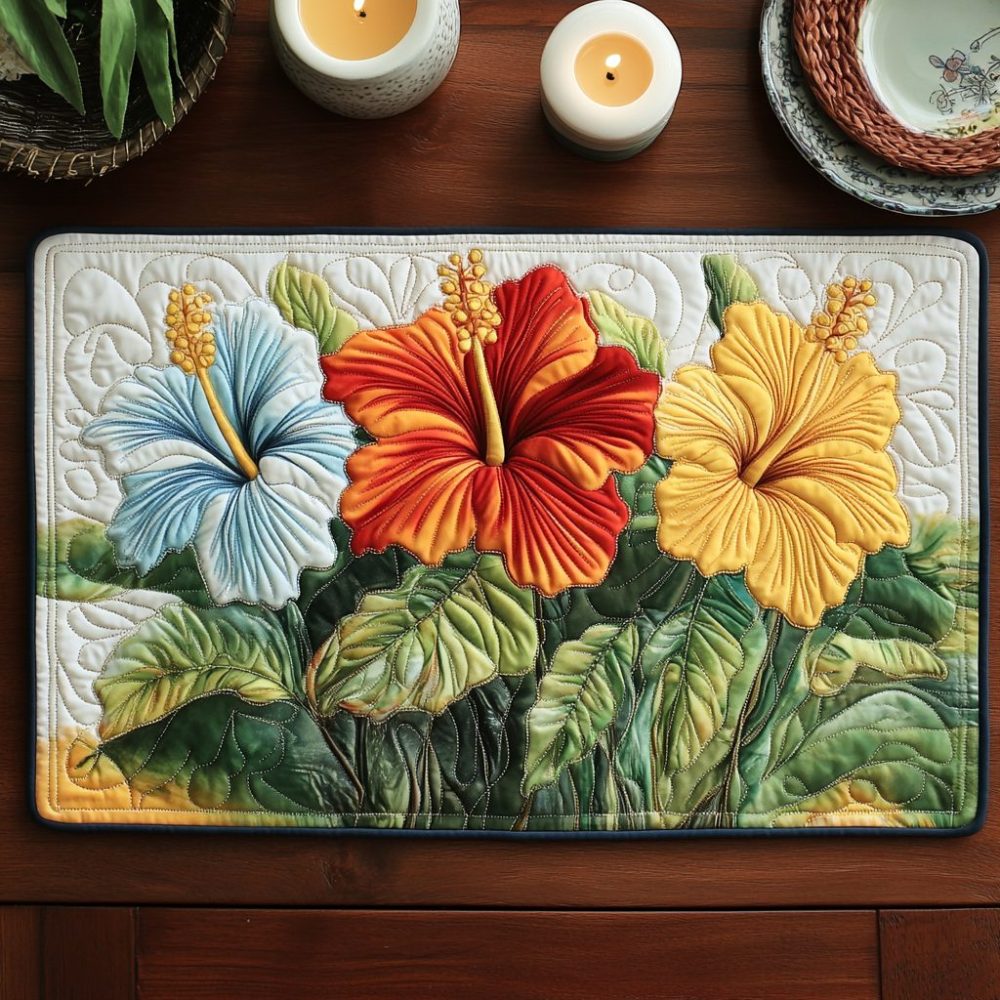 tropical placemat,palm leaf placemat,hibiscus table mat,quilted cotton placemat,beach house decor,summer tableware,tropical dining accessories,easy care placemat