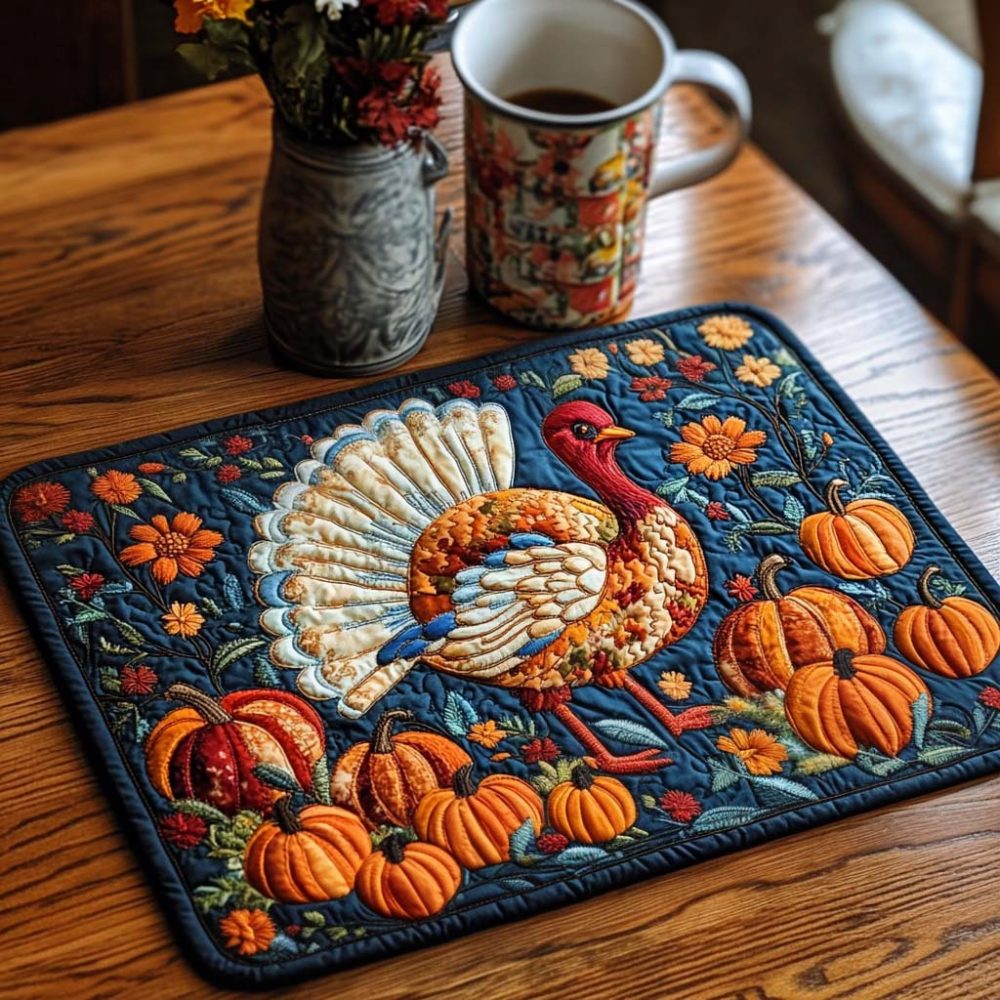 turkey time placemat,thanksgiving placemat,festive table mat,quilted holiday placemat,cotton blend,stain resistant,machine washable