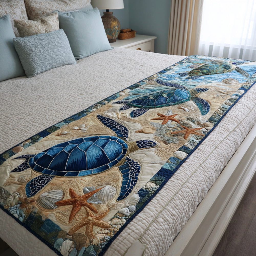 Turtle Bay Quilted Bed Runner — Coastal Turtle Print Bedding Accent, Sea-Inspired Quilted Throw For Beach House Style