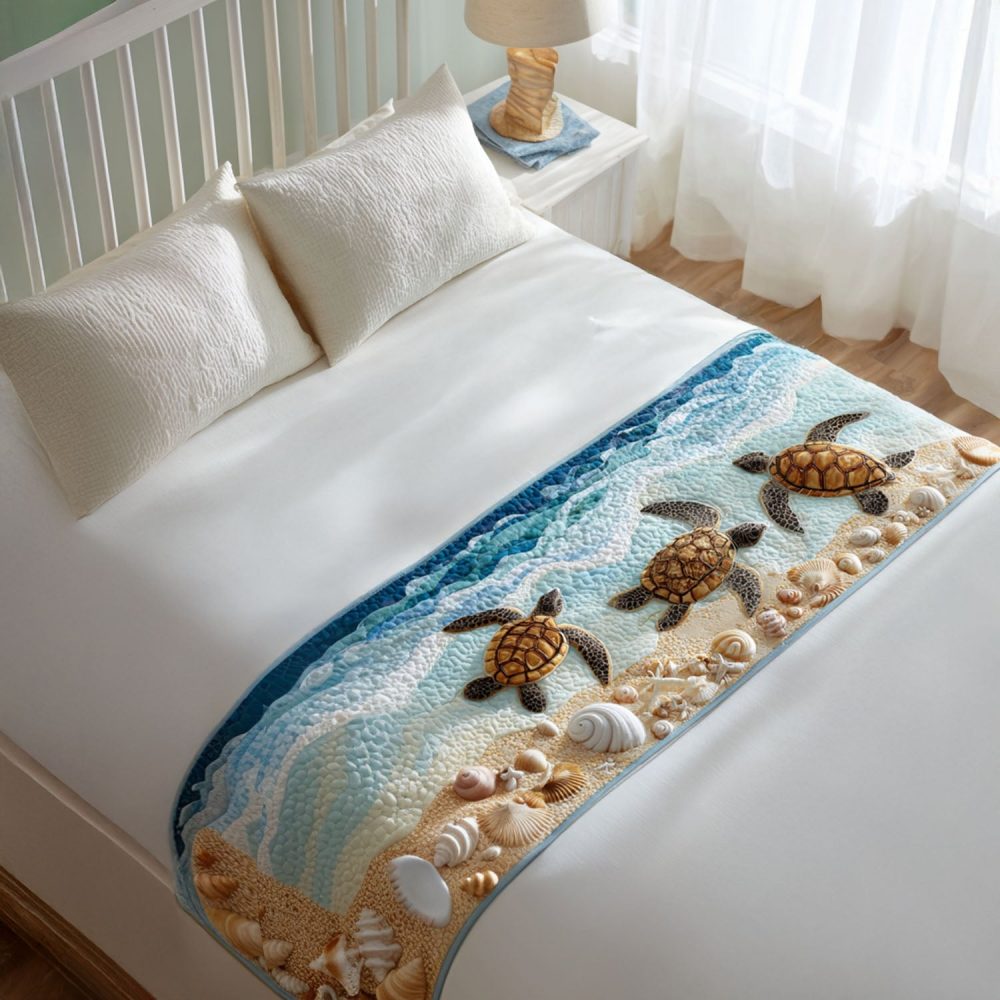 Turtle Pond Explorer Quilted Bed Runner — Nature-Themed Bed Scarf With Pond Motifs, Handcrafted Cotton Accent For Cozy Bedrooms