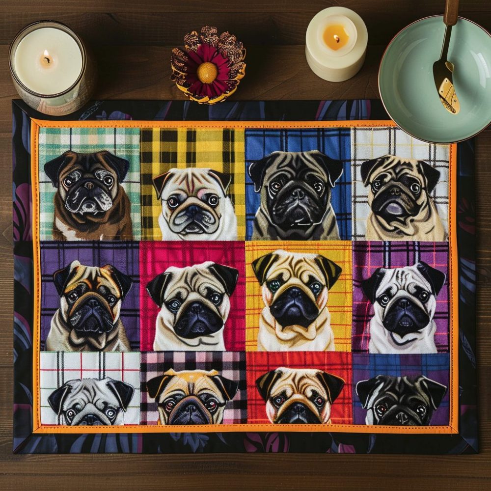 vibrant pug placemat, pug portraits placemat, colorful dog placemat, quilted pet placemat, machine washable placemat, dining table art, gift for pug lover