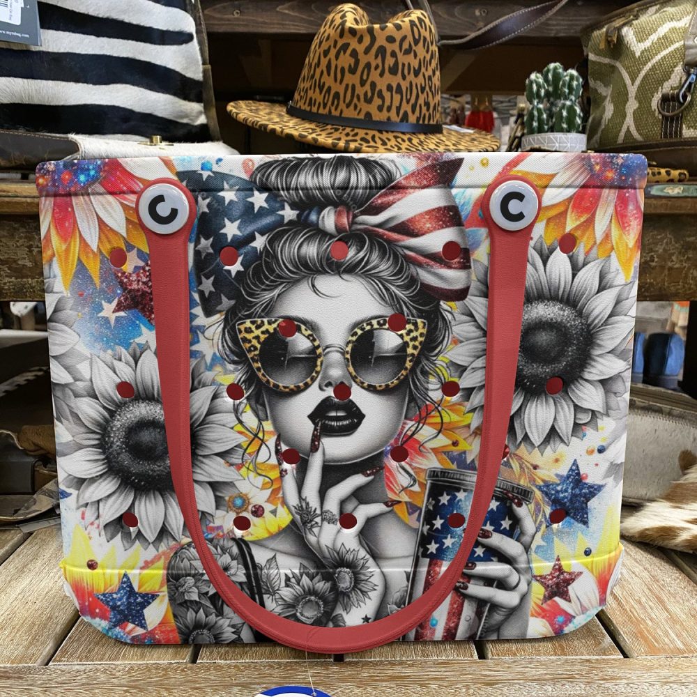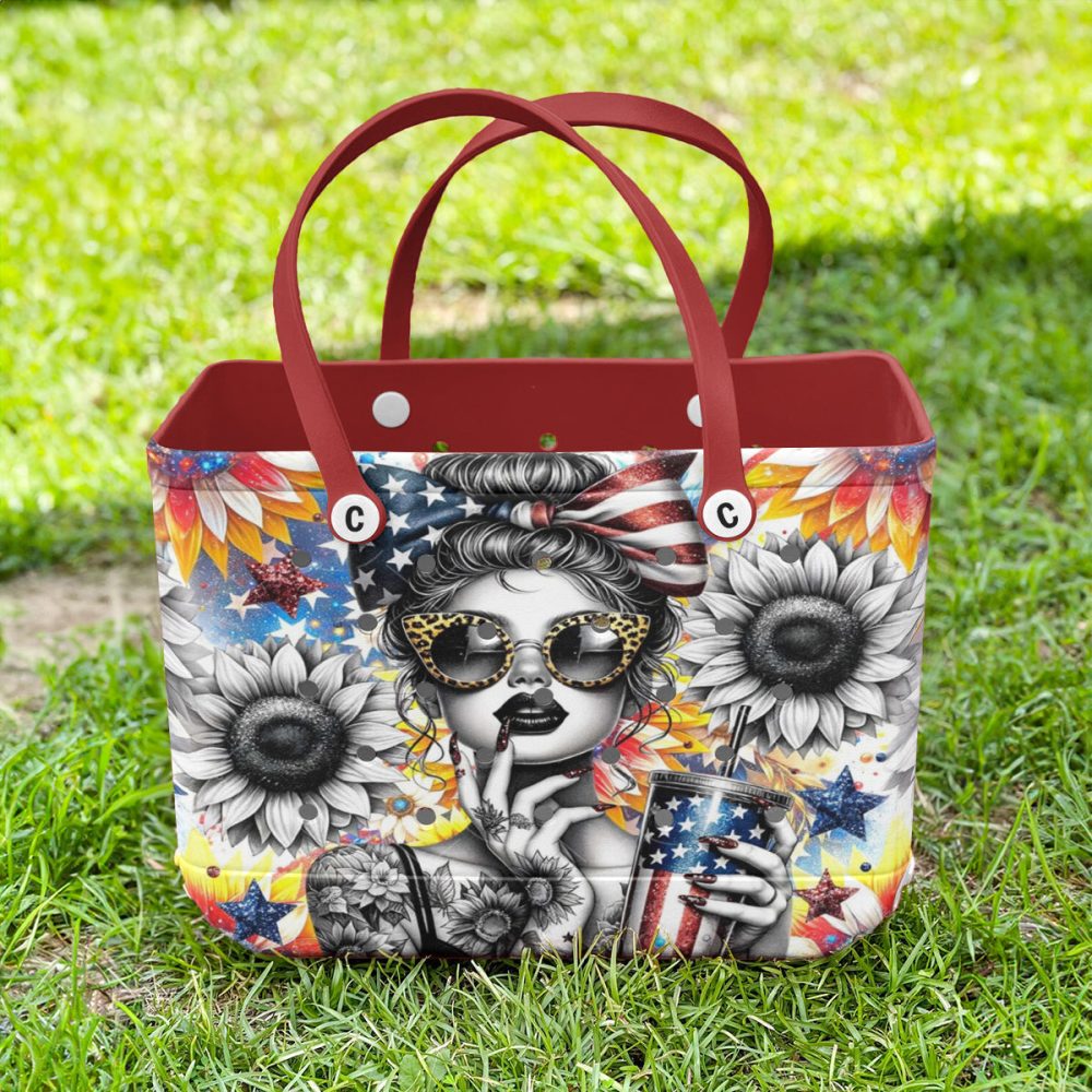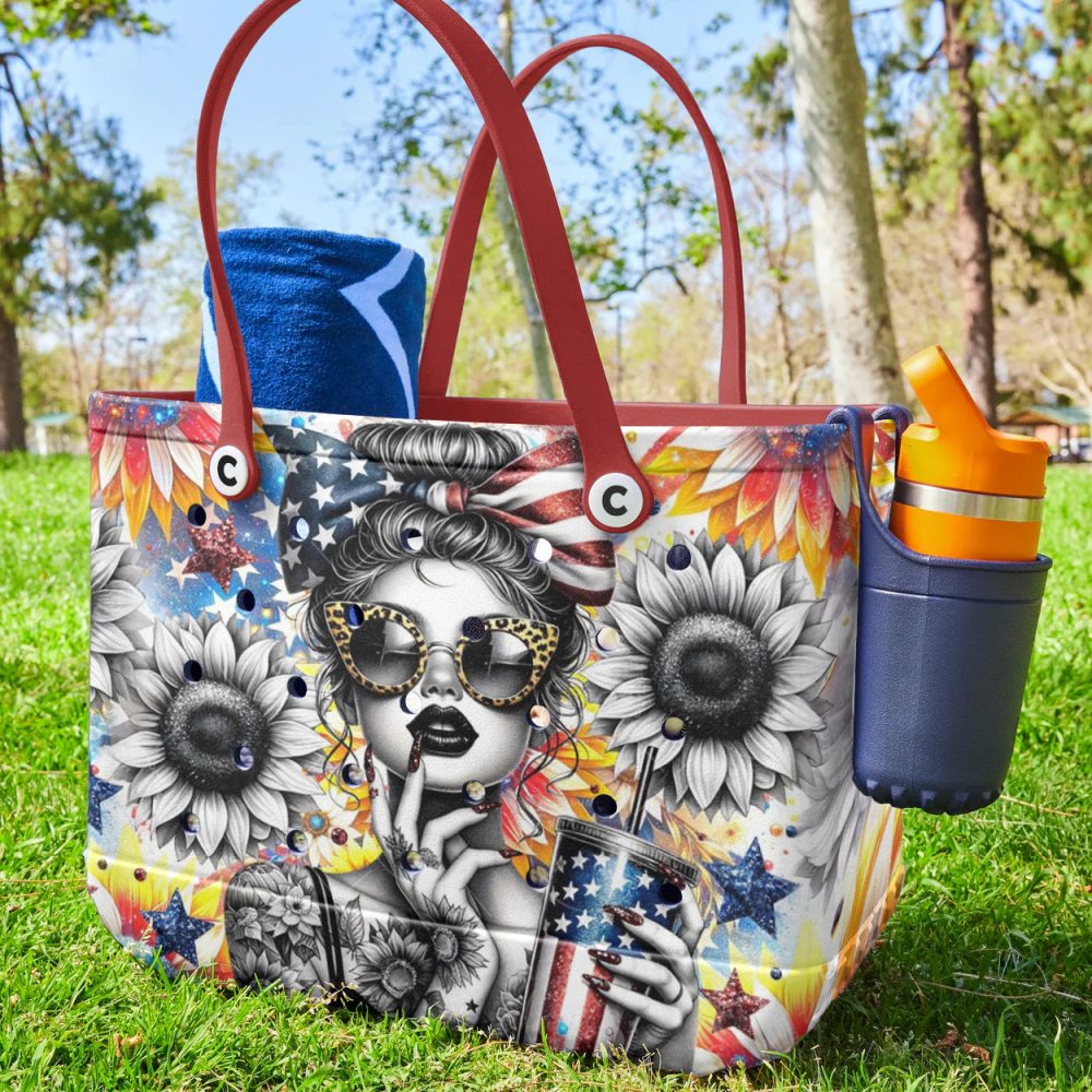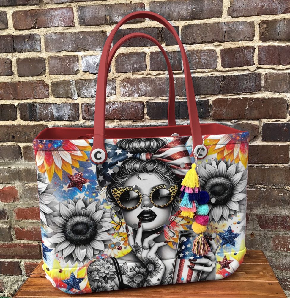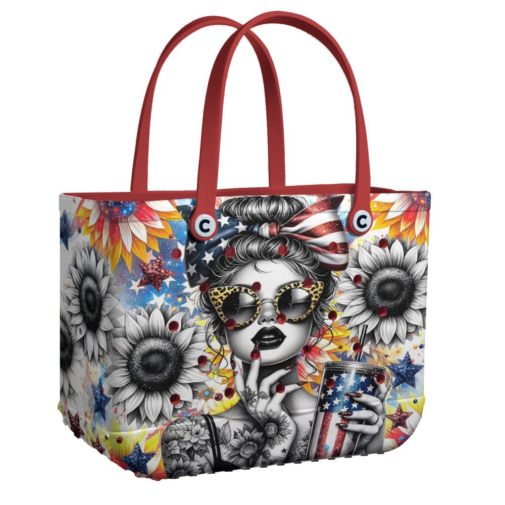Be the first to review “Vibrant Sunflower & Stars Tote Bag – Chic Patriotic Design With Red Handles”