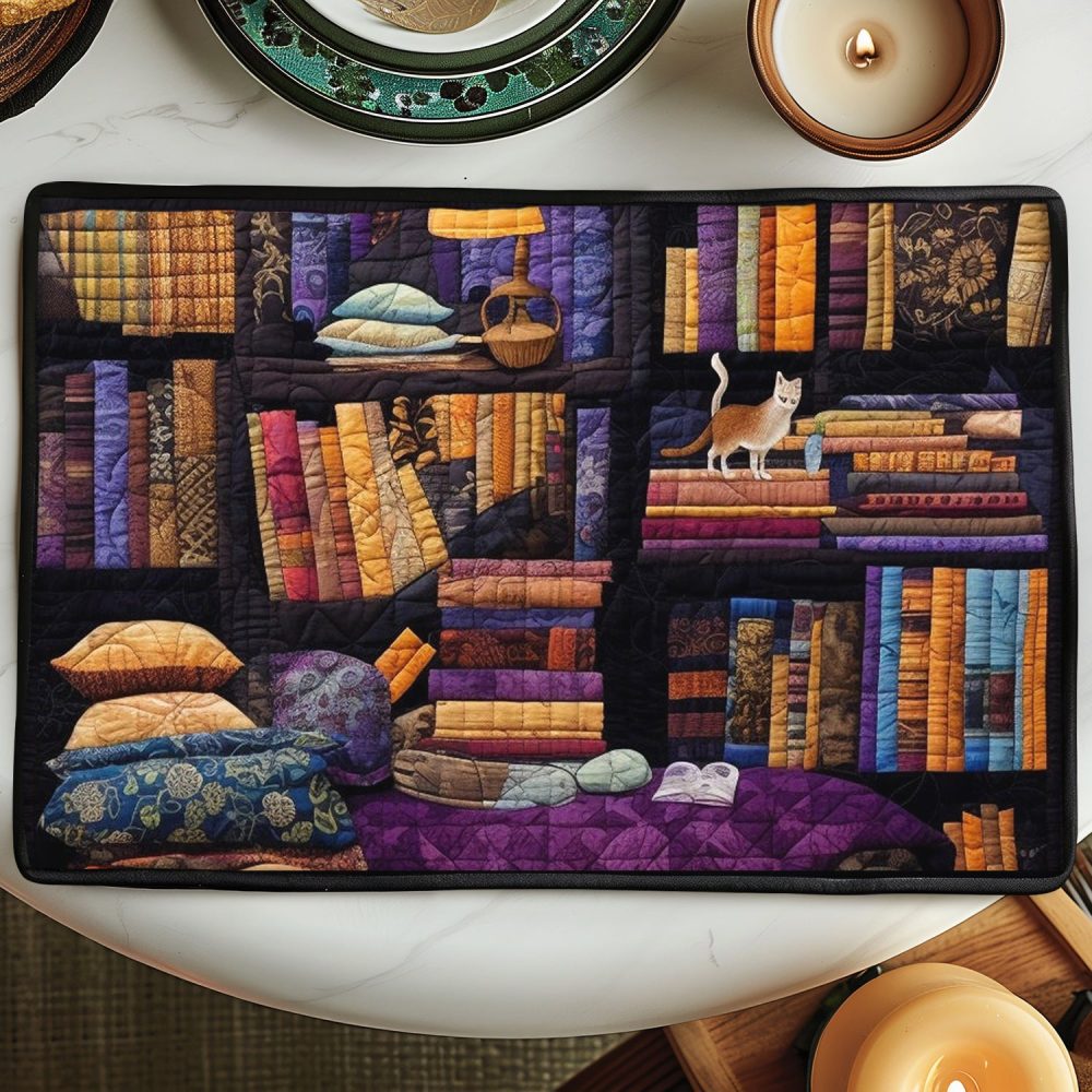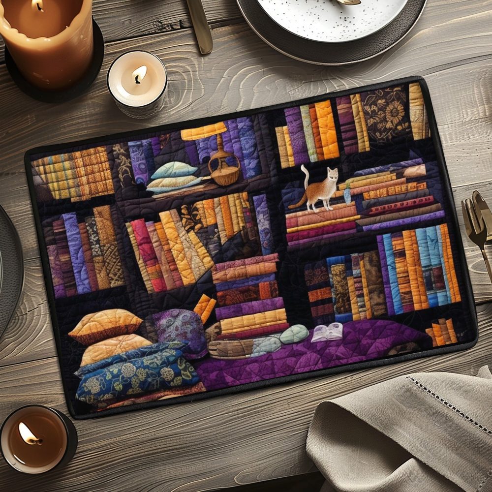 vintage bookshelf placemat,book lover table mat,quilted cotton placemat,retro library decor,table protector,cozy kitchen decor,machine washable placemat