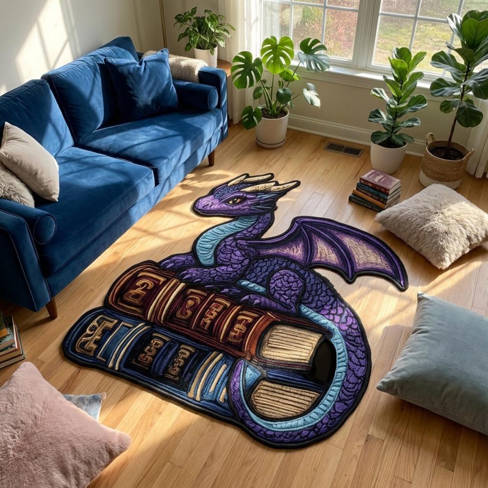 Whimsical Book Dragon Custom-Shaped Area Rug — Cozy Reading Nook Accent Rug, Durable Low-Pile, Non-Slip Backing, Custom Sizes