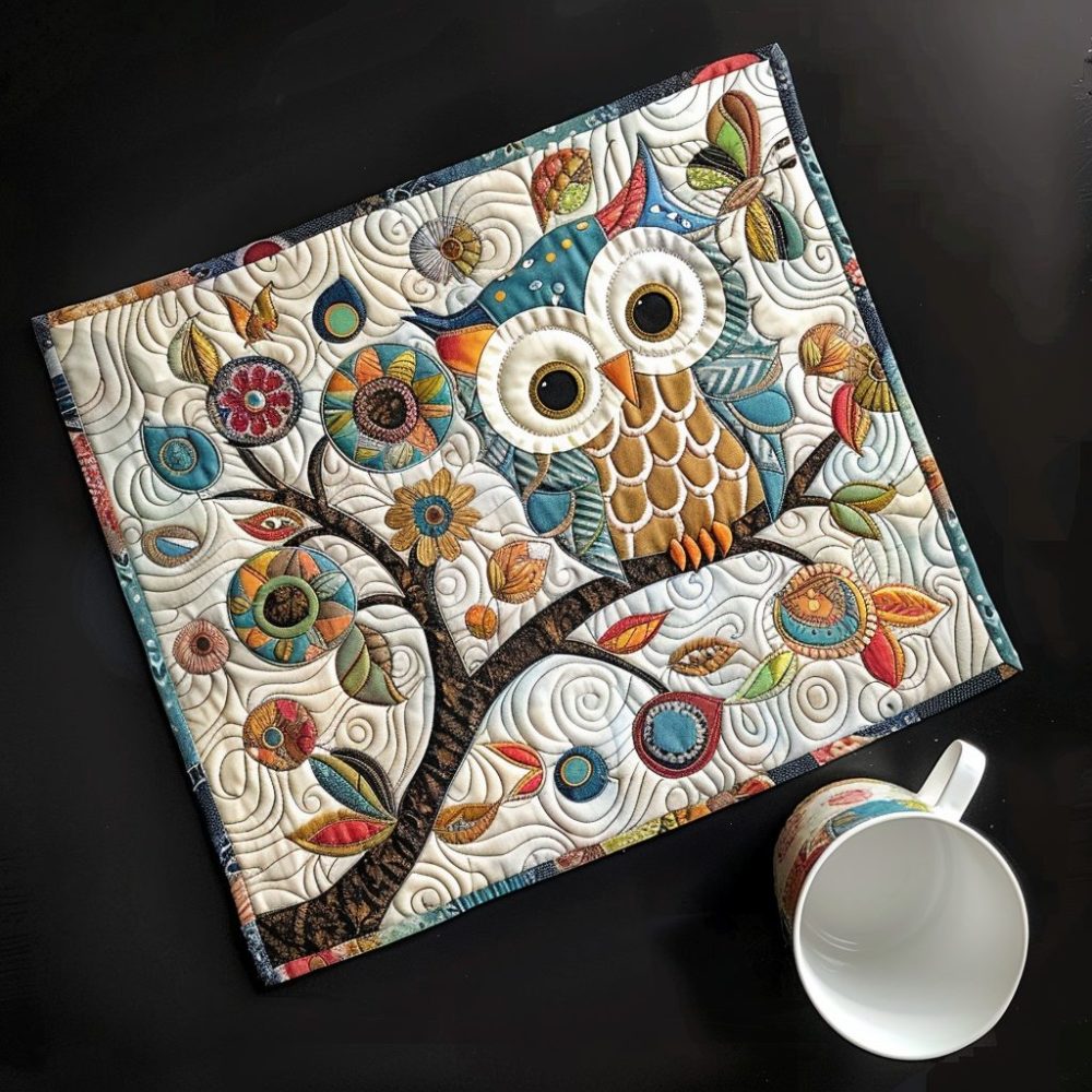 owl placemat,whimsical placemat,woodland table decor,quilted kid-friendly placemat,thick quilting,reversible placemat,easy-care cotton